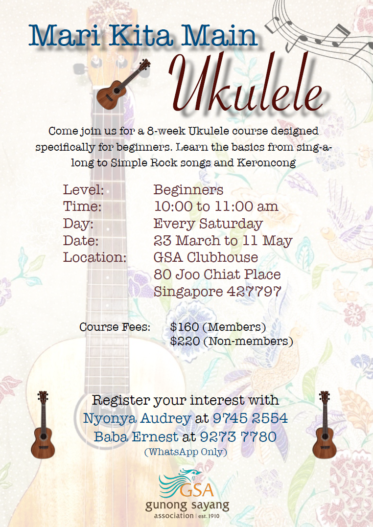 Come join us for an 8-week Ukulele course designed specifically for beginners. Learn the basics from sing-a-long to Simple Rock songs and Keroncong.